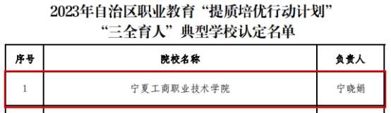 2月26日,自治区教育厅官网发布了《关于2023年度全区职业教育“提质培优行动计划”项目认定结果的公示》,我校有九大类21个项目拟通过《2023年度全区职业教育“提质培优行动计划”项目认定》,其中,拟被认定自治区级“三全育人”典型学校、自治区级示范性职工培训基地、自治区级示范性职教集团(联盟)2项、示范性教师企业实践流动站2项、产教融合实训基地2项、自治区职业院校思政课教学创新团队2项、思想政治理论课示范课堂5项、“课堂革命”典型案例3项、“万人计划”教学名师3人。