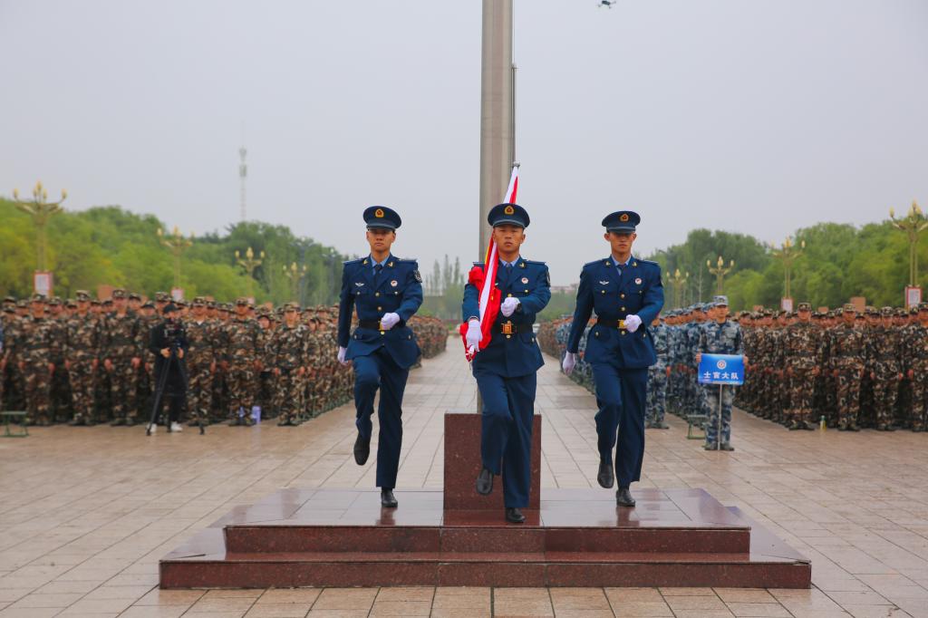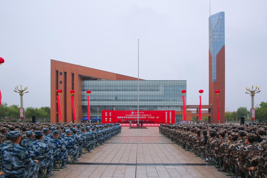 学院党委书记马维敏、院长郭少新为新生军训团授旗,全场旗帜舞动,欢声雷动。