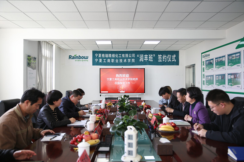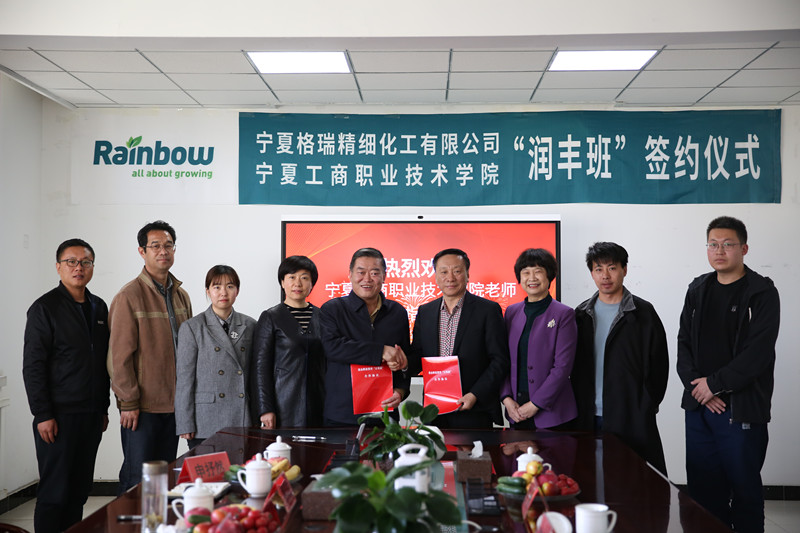 为进一步深化产教深度融合、校企协同育人工作,4月27日下午,宁夏工商职业技术学院与宁夏格瑞精细化工有限公司“润丰”人才订单班签约仪式在宁夏格瑞精细化工有限公司举行。学校校长关世春、副校长宁晓娟,公司宁夏厂区董事长李宏、副总经理蔡美丽,以及双方相关部门负责同志出席了签约仪式。