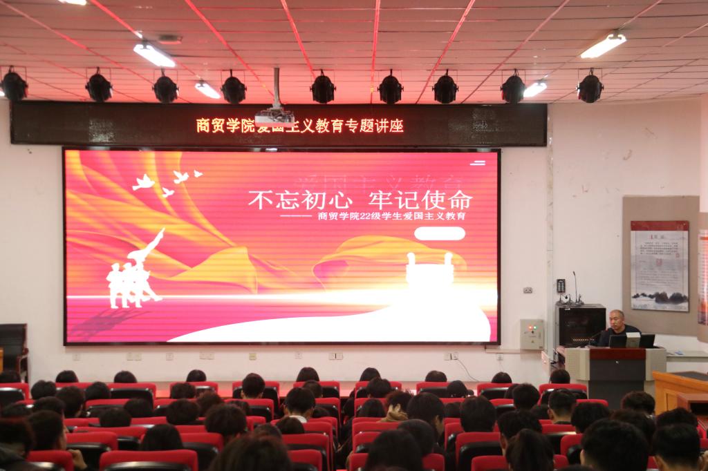 为深入学习贯彻习近平新时代中国特色社会主义思想,落实新时代立德树人根本任务,激发学生爱国热情,引导学生厚植爱国爱党爱社会主义情怀,10月25日商贸学院组织全体学生在清风苑参加“弘扬爱国主义,厚植家国情怀”爱国主义教育专题讲座。此次讲座由商贸学院党总支书记庞鸿斌主讲,全体2022级学生和2023级电子商务专业学生参加。