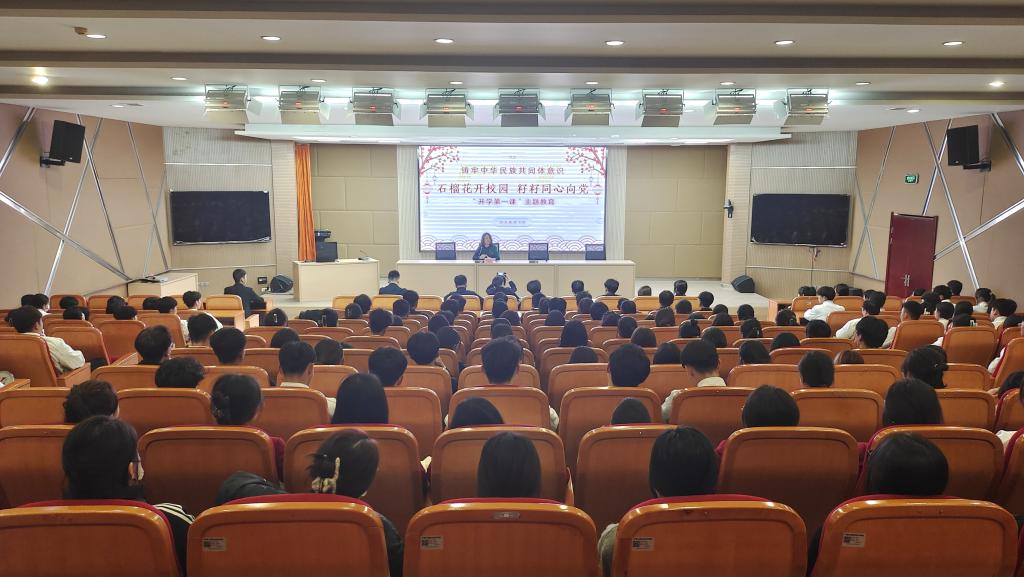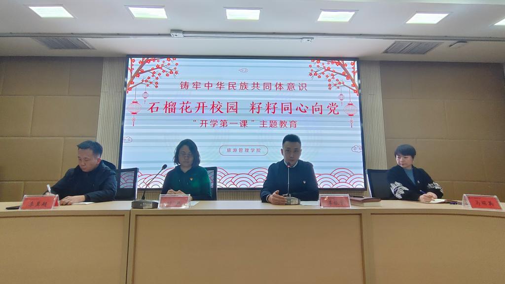 为进一步激发青年学生爱党爱国热情,弘扬爱国主义精神,推动学校铸牢中华民族共同体意识教育有形、有效、走深走实。3月13日下午,旅游管理学院举办“石榴花开校园 籽籽同心向党”铸牢中华民族共同体意识主题教育活动。活动由学院党总支副书记、院长叶燕主讲,专职副书记李振宇主持,学办主任李冀超、团总支书记马丽英及学生代表参加。