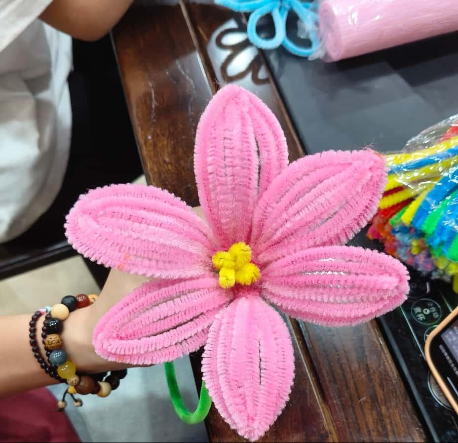 手工制作过程中,同学们发挥创造力与想象力,把一根根普通的扭扭棒、一卷卷皱纹纸弯折成郁金香、小雏菊、玫瑰花等不同风格、形态各异的花束和摆件,不仅是创意的结晶,更是大家内心积极力量的具象化呈现。同时,围绕创作灵感分享作品名称的由来及制作过程中的心情与感悟。有小组制作的“向阳花”,寓意着对美好生活的热爱与希望;有小组创作的“友谊之花”,承载着对同窗情谊的珍视。