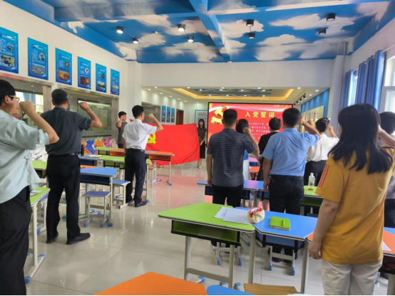 随后,全体教师党员在党旗下庄严宣誓,重温入党誓词。大家举起右拳,铿锵有力地宣读誓词,表达了对党的忠诚和为共产主义事业奋斗终身的决心。